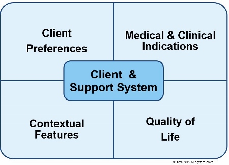 | Client’s preferences | What the client/support system desires in terms of options for healthcare services. This also considers the client’s ability to make decisions that are consistent with his/her own authentic desires and wishes. |