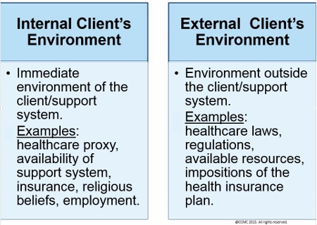 This quadrant refers to the ways the client’s support system circumstances, psychosocial network, spiritual orientation, religious beliefs, or economic resources function as important considerations in resolving ethical conflicts or disputes. It also refers to the characteristics of the external environment as well, such as laws, regulations, and access to healthcare resources and services.