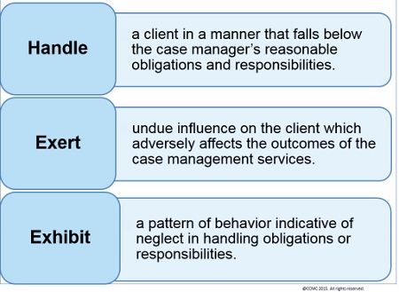 - engages in sexually intimate behavior with a client; or accepts as a client an individual with whom the case manager has been sexually intimate (CCMC, 2015, p. 9)