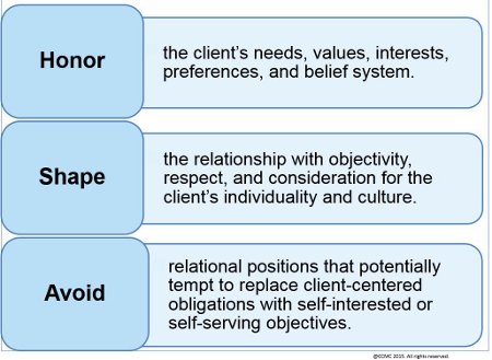 - “not enter into a relationship with a client (business, personal, or otherwise) that interferes with that objectivity” (CCMC, 2015, p. 8).