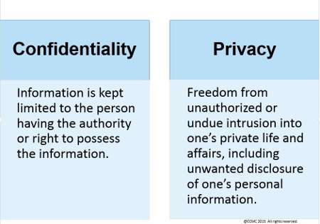 A breach in confidentiality occurs when you reveal information to someone who is not supposed to have it; a breach that concerns privacy results when you fail to protect confidential information from reaching persons who have no right or need to know it.
