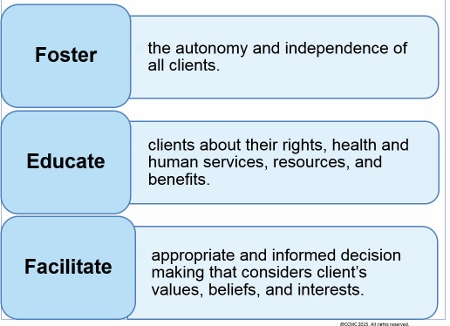 Advocacy in case management is fundamentally other-regarding and client empowering. As much as possible, your advocacy consists of enabling clients/support systems to navigate their world according to their values, beliefs, culture, and interests.